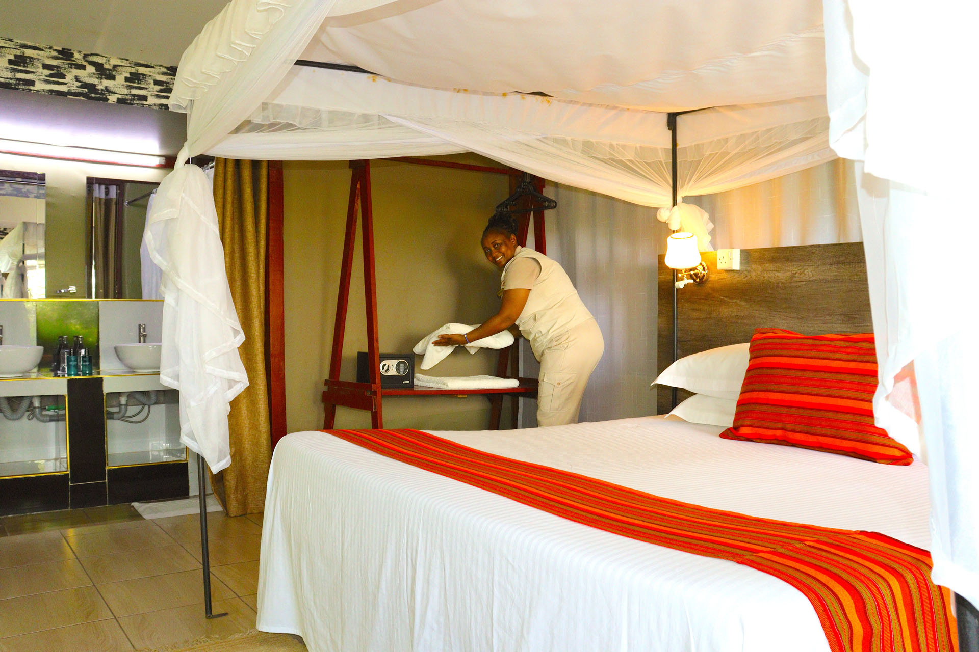 We have two categories of rooms at Zebra Plains Mara Camp, Savannah facing rooms and Hillside facing rooms but all have similar amenities that you will need during your stay with us; Ensuite bathrooms with both cold and hot running showers, twin basins, flashing toilets, study desk and verandah with safari director chairs and our family tents are interconnected by a private lounge. We also provide refillable shower gels, hair shampoos and body lotions.